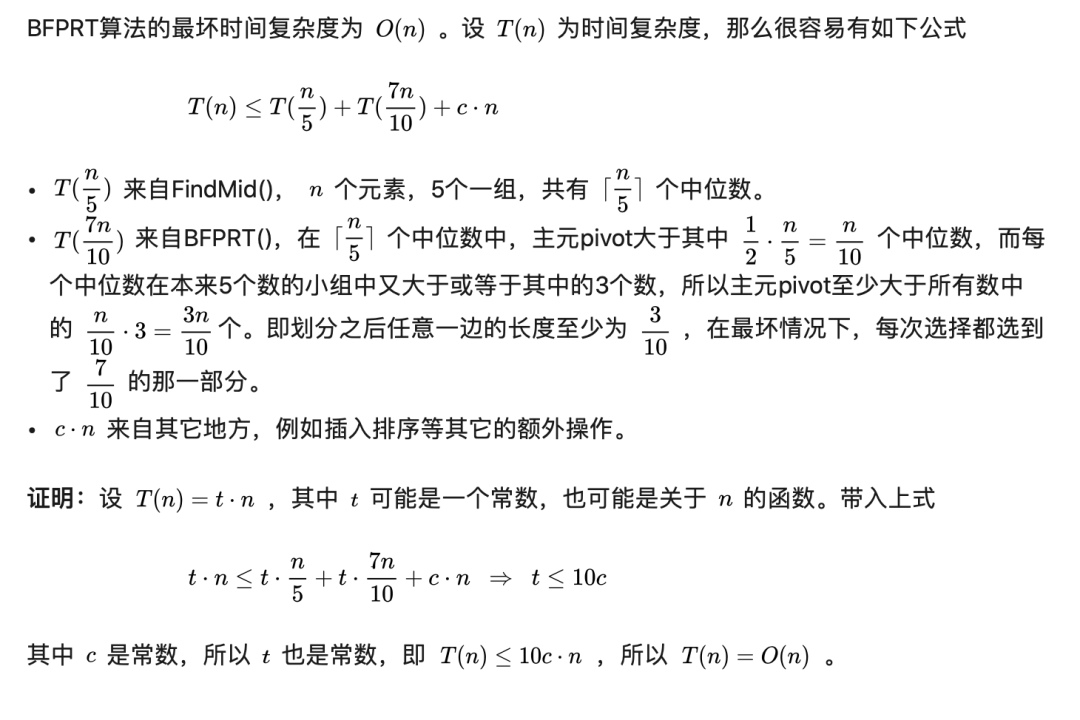 let findKthLargest = function(nums, k) { return nums[bfprt(nums, 0, nums.length - 1, nums.length - k)]}let bfprt = (arr, left , right, k) => { let index if(left < right) { // 划分数组 index = partition(arr, left, right) // Top k if(k === index) { return index } else if(k < index) { // Top k 在左边 return bfprt(arr, left, index-1, k) } else { // Top k 在右边 return bfprt(arr, index+1, right, k) } } return left}let partition = (arr, left, right) => { // 基准 var datum = arr[findMid(arr, left, right)], i = left, j = right // 开始调整 while(i < j) { // 左指针右移 while(arr[i] < datum) { i++ } // 右指针左移 while(arr[j] > datum) { j-- } // 交换 if(i < j) swap(arr, i, j) // 当数组中存在重复数据时,即都为datum,但位置不同 // 继续递增i,防止死循环 if(arr[i] === arr[j] && i !== j) { i++ } } return i}/** * 数组 arr[left, right] 每五个元素作为一组,并计算每组的中位数, * 最后返回这些中位数的中位数下标(即主元下标)。 * * @attention 末尾返回语句最后一个参数多加一个 1 的作用其实就是向上取整的意思, * 这样可以始终保持 k 大于 0。 */let findMid = (arr, left, right) => { if (right - left < 5) return insertSort(arr, left, right); let n = left - 1; // 每五个作为一组,求出中位数,并把这些中位数全部依次移动到数组左边 for (let i = left; i + 4 <= right; i += 5) { let index = insertSort(arr, i, i + 4); swap(arr[++n], arr[index]); } // 利用 bfprt 得到这些中位数的中位数下标(即主元下标) return findMid(arr, left, n);}/** * 对数组 arr[left, right] 进行插入排序,并返回 [left, right] * 的中位数。 */let insertSort = (arr, left, right) => { let temp, j for (let i = left + 1; i <= right; i++) { temp = arr[i]; j = i - 1; while (j >= left && arr[j] > temp) { arr[j + 1] = arr[j]; j--; } arr[j + 1] = temp; } return ((right - left) >> 1) + left;}// 交换let swap = (arr, i , j) => { let temp = arr[i] arr[i] = arr[j] arr[j] = temp}复杂度分析:
