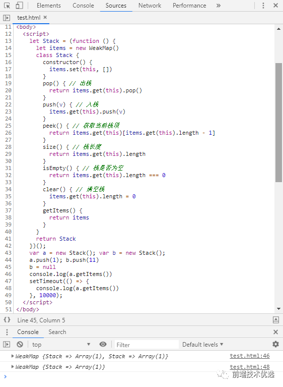 如图所示,变量a、b创建了两个栈实例,并分别往各自栈里添加了一个数字元素。这时闭包items中是存在两个栈的。然后把变量 b 设为 null ,这时变量 b 所创建的栈实例对象失去了强引用,只剩下 WeakMap 键名的弱引用,但是打印出来的items 中仍然存在两个栈,因为此时垃圾回收机制没有运行。过了十秒之后,chrome 浏览器的垃圾回收机制触发,便把items 中的失效的栈清除了,此时打印出来 itmes 中只剩下一个栈了。(P.S. 经测试发现目前版本的 V8 引擎垃圾回收机制至多十秒就清一次啊)