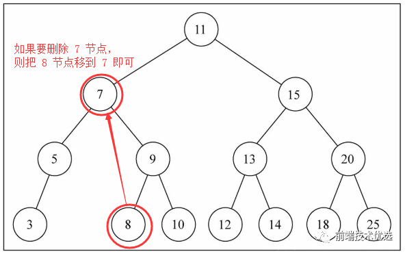 const BinarySearchTree = (function(){ const Node = function (key) { this.key = key this.left = null this.right = null } const insertNode = function (node, newNode) { // 插入节点辅助函数 if (newNode.key < node.key) { if (node.left) { insertNode(node.left, newNode) } else { node.left = newNode } } else { if (node.right) { insertNode(node.right, newNode) } else { node.right = newNode } } } const searchNode = function (node, key) { // 搜索节点辅助函数 if (!node) { return false } if (key < node.key) { return searchNode(node.left, key) } else if (key > node.key) { return searchNode(node.right, key) } else { return true } } const minNode = function (node) { // 找到最小节点并返回key if (!node) { return null } if (node.left) { return minNode(node.left) } else { return node.key } } const maxNode = function (node) { // 找到最大节点并返回key if (!node) { return null } if (node.right) { return maxNode(node.right) } else { return node.key } } const findMinNode = function (node) { // 找到最小节点并返回node对象 if (!node) { return null } if (node.left) { return findMinNode(node.left) } else { return node } } const removeNode = function (node, key) { // 移除节点并返回传入的 node if (node === null) { return null } if (key < node.key) { // 这种情况需要更新node.left,然后返回更新了node.left的新的node node.left = removeNode(node.left, key) return node } else if (key > node.key) { // 这种情况需要更新node.right,然后返回更新了node.right的新的node node.right = removeNode(node.right, key) return node } else { // 这种情况需要更新node.key或者其他更新手段(包括直接将node变为null, 或更新node.right),返回的也是更新后的node // 情况1,被移除的是叶子节点 if (node.left === null && node.right === null) { node = null return node } // 情况2,被移除的是只有一个子节点的节点 if (node.left === null) { // 只有右子节点 node = node.right return node } else if (node.right === null) {//只有左子节点 node = node.left return node } // 情况3,被移除的是有两个子节点的节点 const aux = findMinNode(node.right) // 找到子树中的最小节点,它肯定是一个叶子节点 node.key = aux.key // 将node的key设置为aux的key,达到删除效果,但此时有两个一样的key node.right = removeNode(node.right, aux.key) // 移除以node.right为root的树上的重复的叶子节点aux.key return node } } class BinarySearchTree { constructor () { this.root = null } insert (key) { // 插入节点 let newNode = new Node(key) if (!this.root) { this.root = newNode } else { insertNode(this.root, newNode) } } serach (key) { // 搜索节点,返回布尔值 return searchNode(this.root, key) } min () { // 最小节点 return minNode(this.root) } max () { // 最大节点 return maxNode(this.root) } remove (key) { // 删除节点 this.root = removeNode(this.root, key) } } return BinarySearchTree})()这里面只有 remove 方法比较复杂,要删除的节点可能是 “叶子节点”、“只有右子节点的”、“只有左子节点的”、“左右子节点都有的” 等。