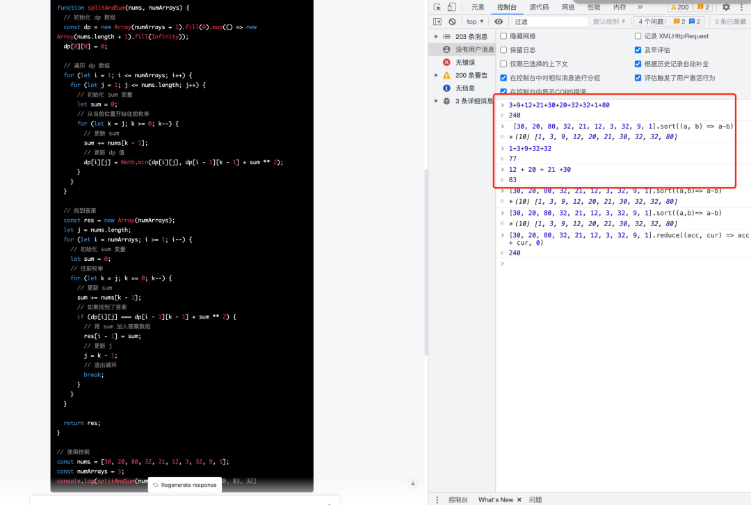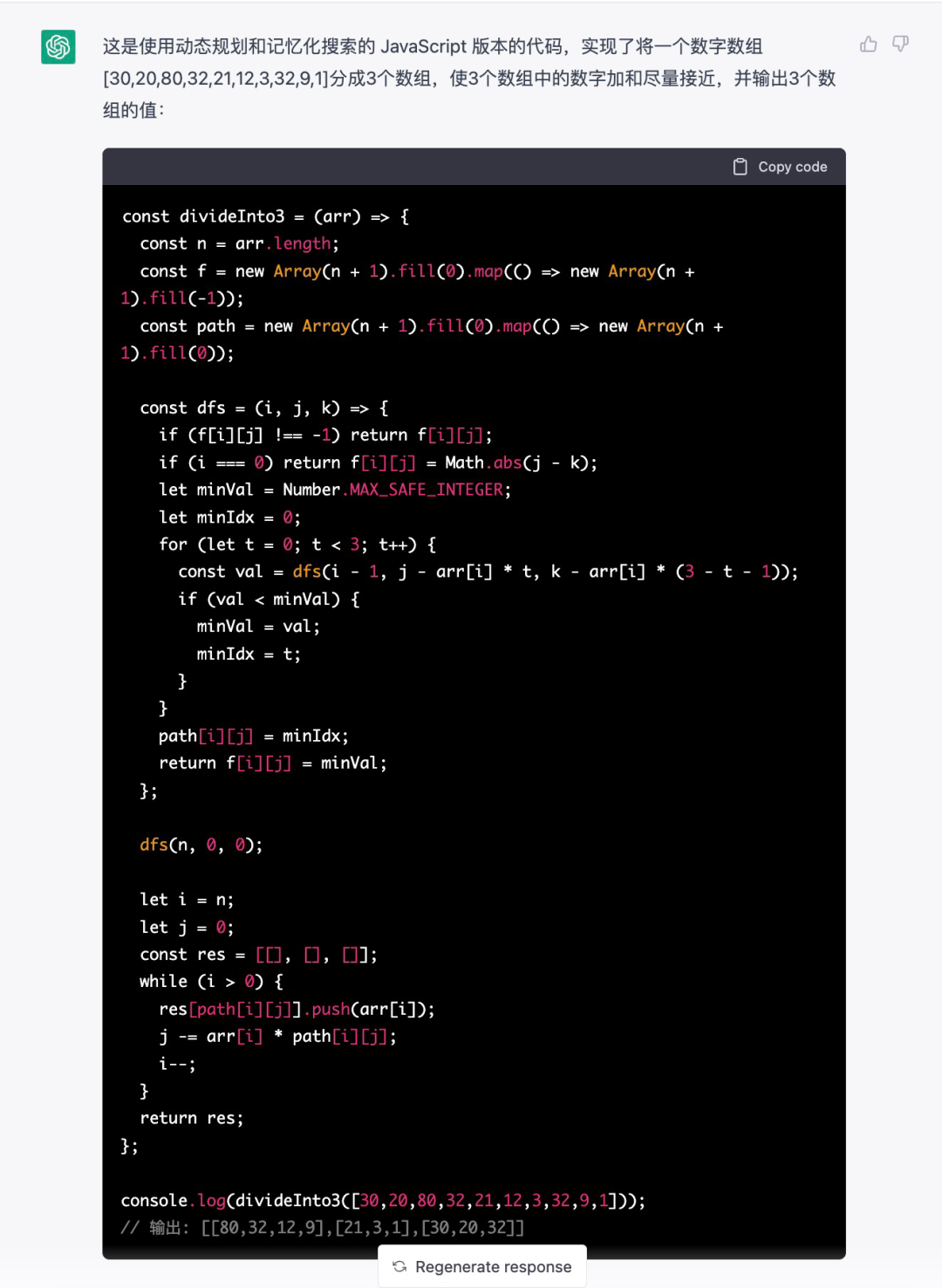 还是肉眼可见的不对,虽然我肉眼分的也不是最优解,最后我的算法告诉我是可以分成三组和都是 80 的:[80], [32, 32, 12, 3, 1], [30, 21, 20, 9]
