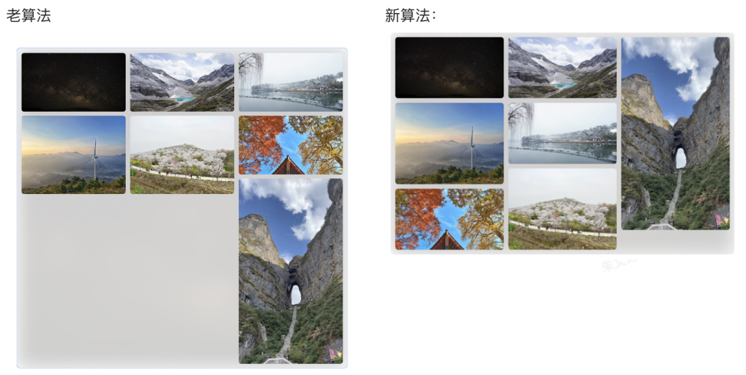所以当最后一张是长图时就会对布局的齐平性导致很大的冲击。(当然这不是说社区的方案都 low,开源产品可能更多考虑了普适情况,譬如可能无法提前知道所有图片尺寸信息,全部加载完再重新布局一次又给用户带来干扰,甚至是懒加载场景更不好优雅的展示处理。)
