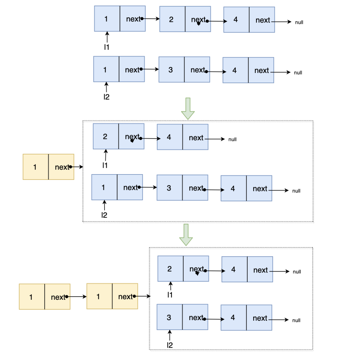 确定解题思路: 从链表头开始比较,l1 与 l2 是有序递增的,所以比较 l1.val 与 l2.val 的较小值就是合并后链表的最小值,次小值就是小节点的 next.val 与大节点的 val 比较的较小值,依次递归,直到递归到 l1 l2 均为 null