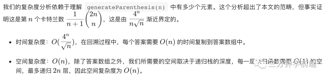 const generateParenthesis = (n) => { const res = [] const dfs = (path, left, right) => { // 肯定不合法,提前结束 if (left > n || left < right) return // 到达结束条件 if (left + right === 2 * n) { res.push(path) return } // 选择 dfs(path + '(', left + 1, right) dfs(path + ')', left, right + 1) } dfs('', 0, 0) return res}复杂度分析(来源 leetcode 官方题解):