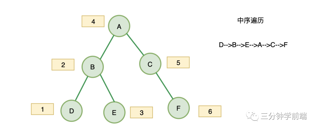 对于二叉树中的任意一个节点,先打印它的左子树,然后是该节点,最后右子树