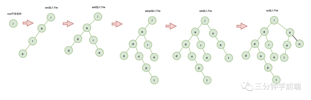 遍历待插入字符,从根节点逐字符查找 Trie 树,如果字符查找失败则插入,否则继续查找下一个字符