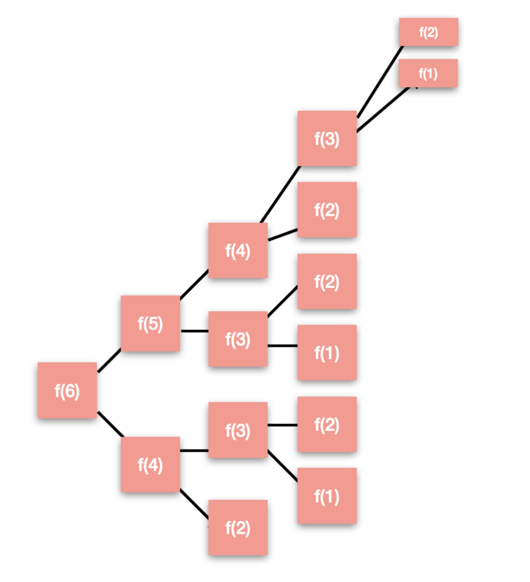 可以看到,因为没有把结果保存,出现了很多重复计算的步骤:为了得到 f(6) 的结果,需要计算 f(5) 和 f(4), 为了得到 f(5) 的结果,需要计算 f(4) 和 f(3),这里两次计算 f(4) 是独立的事件,也就是说,我们做了很多重复工作。