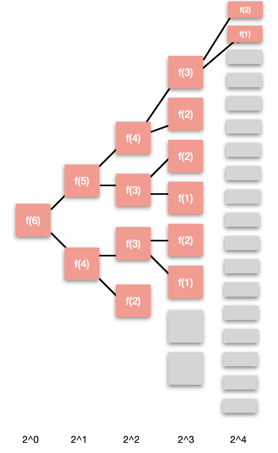 上面这种解法时间复杂度很高在于做了很多重复计算,从递归公式能看出来:f(n)=f(n-1)+f(n-2)=f(n-2)+f(n-3)+f(n-3)+f(n-4),一生二,二生四,四生八,整个计算过程就像是发散开来一样。每一次调用都没有保留下 “状态”,造成了大量的计算浪费。