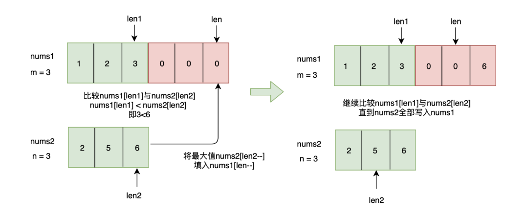 len2大于等于 0 且len1小于 0,此时nums1已全部写入,nums2还未合并完,仅需将nums2的剩余元素(0…len)写入nums2即可,写入后合并完成。若
