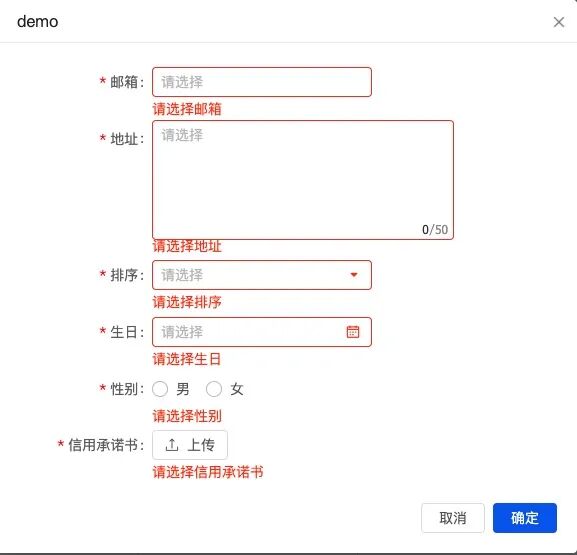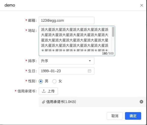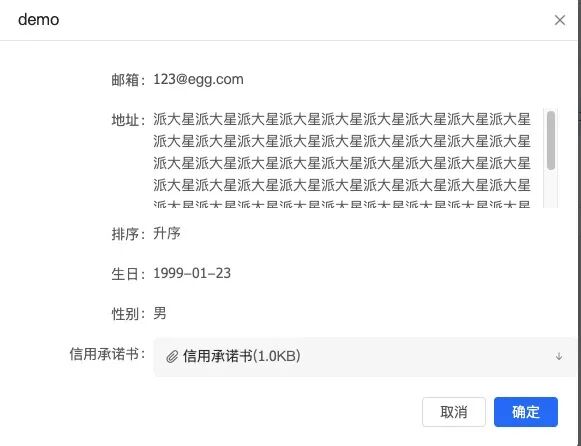 const Demo = (props) => { const { form } = props; // 数据 const obj = { email: '123@egg.com', addr: '派大星派大星派大星派大星派大星派大星派大星派大星派大星派大星派大星派大星派大星派大星派大星派大星派大星派大星派大星派大星派大星派大星派大星派大星派大星派大星派大星派大星派大星派大星派大星派大星派大星派大星派大星派大星派大星派大星派大星派大星派大星派大星派大星派大星派大星派大星派大星派大星派大星派大星派大星派大星派大星派大星派大星派大星派大星派大星派大星派大星', sort: 'up', birthday: '1999-01-23', sex: 'male', file: [{ fileId: '123', name: '信用承诺书', size: 1024 }], }; // 因为数据的形式默认为表单,所以 dataForm: 'form' 可不配置 const formConf = [{ label: '邮箱', field: 'email', initialValue: obj.email, rules: [emailRule], // emailRule 为邮箱校验规则 }, { label: '地址', field: 'addr', initialValue: obj.addr, formItemType: 'TextArea', }, { label: '排序', field: 'sort', initialValue: obj.sort, formItemType: 'Select', options: [{ value: 'up', label: '升序' }, { value: 'down', label: '降序' }], }, { label: '生日', field: 'birthday', initialValue: obj.birthday, formItemType: 'DatePicker', format: 'YYYY-MM-DD', // 日期组件的格式配置字段 }, { label: '性别', field: 'sex', initialValue: obj.sex, formItemType: 'RadioGroup', options: [{ value: 'male', label: '男' }, { value: 'female', label: '女' }], }, { label: '信用承诺书', field: 'file', initialValue: obj.file, formItemType: 'Upload', }]; const dataForm = isEdit ? 'form' : 'text'; // 将配置遍历传入 renderDataForm // 当然你也可以封装成组建,直接向组建传入 form、formConf,减少遍历的重复书写和整洁 return formConf.map(item => renderDataForm(form, item, dataForm));最终呈现如下: