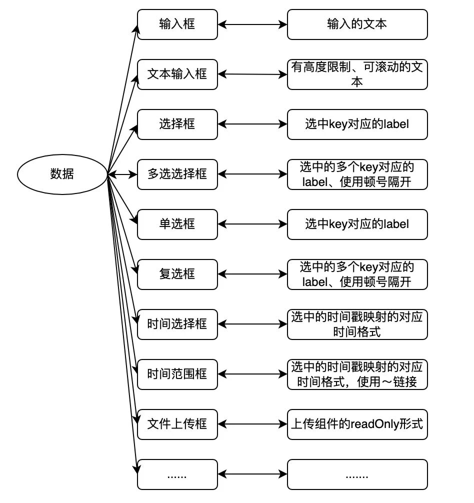 export const renderFormItem = (form, rest) => { const { getFieldDecorator } = form; const { label = '', field = '', formItemType = 'input', initialValue, required = true, rules = [], ...itemRest } = rest; return (getFieldDecorator(field, { initialValue, rules: [ // 必填提示 { required, message: renderMessage(formItemType, label) }, ...rules, ], ...(formItemType === 'upload' ? { // Upload 组件的通用配置 getValueFromEvent: (e) => { if (Array.isArray(e)) { return e; } return e && e.fileList; }, valuePropName: 'fileList' } : {}), })( renderItem(formItemType, itemRest) ));};// 选择表单组件const renderItem = (formItemType, itemRest) => { const { options = [], CustomFormItem } = itemRest; const obj = { Input, TextArea, InputNumber, Upload, Select, RadioGroup, CheckboxGroup, DatePicker }; // 自定义的表单组件 if (formItemType === 'CustomFormItem') { return <CustomFormItem {...itemRest} />; } // 不存在对应组件时返回默认的 Input 组件 if (!obj[formItemType]) { return <Input placeholder="请输入" {...itemRest} />; } const Comp = obj[formItemType]; // 双标签组件处理 if (['Select', 'Upload'].includes(formItemType)) { return formItemType === 'Upload' ? ( <Upload {...itemRest} > <Button><Icon type="upload" />上传</Button> </Upload> ) : ( <Comp {...getDefaultCompProps(itemRest)} {...itemRest} > {options.map(el => ( <Option key={el.value} value={el.value}>{el.label || el.name}</Option>))} </Comp> ); } // 单标签组件 return <Comp {...getDefaultCompProps(itemRest)} {...itemRest} />;};// 获取组件属性const getDefaultCompProps = (conf = {}) => { const { formItemType } = conf; const props = {}; props.placeholder = renderMessage(formItemType); if (formItemType === 'InputNumber') { // zeroOmit 小数点后多余的零是否省略,limitDecimal 限制最长的小数位数 const { zeroOmit = true, limitDecimal = 6 } = conf; const limitDecimalsF = (value) => { const reg = new RegExp(`^(-)*(\\d+)\\.(\\d{${limitDecimal}}).*$`); return `${value}`.replace(reg, '$1$2.$3'); }; if (zeroOmit) { props.formatter = limitDecimalsF; props.parse = limitDecimalsF; } } if (formItemType === 'Input') { props.maxLength = 100; // 输入框的默认最大输入字符长度 } if (formItemType === 'TextArea') { props.maxLength = 500; // 文本框的默认最大输入字符长度 } return props;};3、映射文本