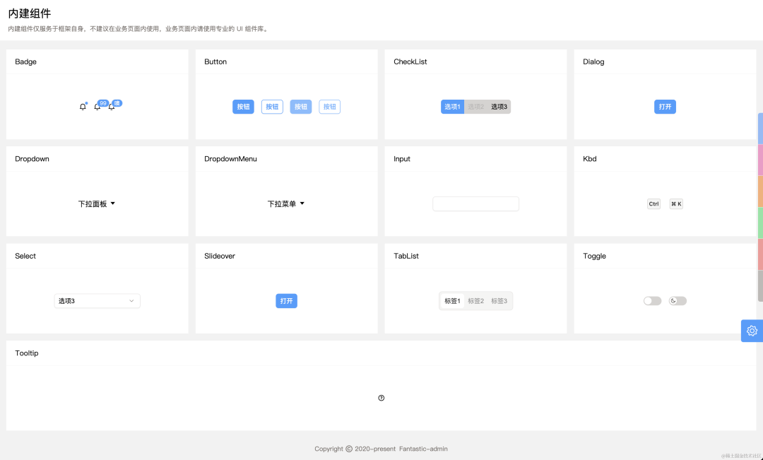 同时也在开发过程中发现了一些被遗漏组件,于是边做边补,最终大概做了 10 多个组件。虽然看着不少,它们都秉持着最小可用的状态。什么意思呢?就是我不会给它们设计太多的 API ,因为它们的定位和三方 UI 组件库不同,它们只要满足框架本身使用即可,用不到的 API 不会进行开发。并且使用上也不会有太大负担,如果不是对框架进行二次开发,开发者是可以完全不用关注这部分组件。