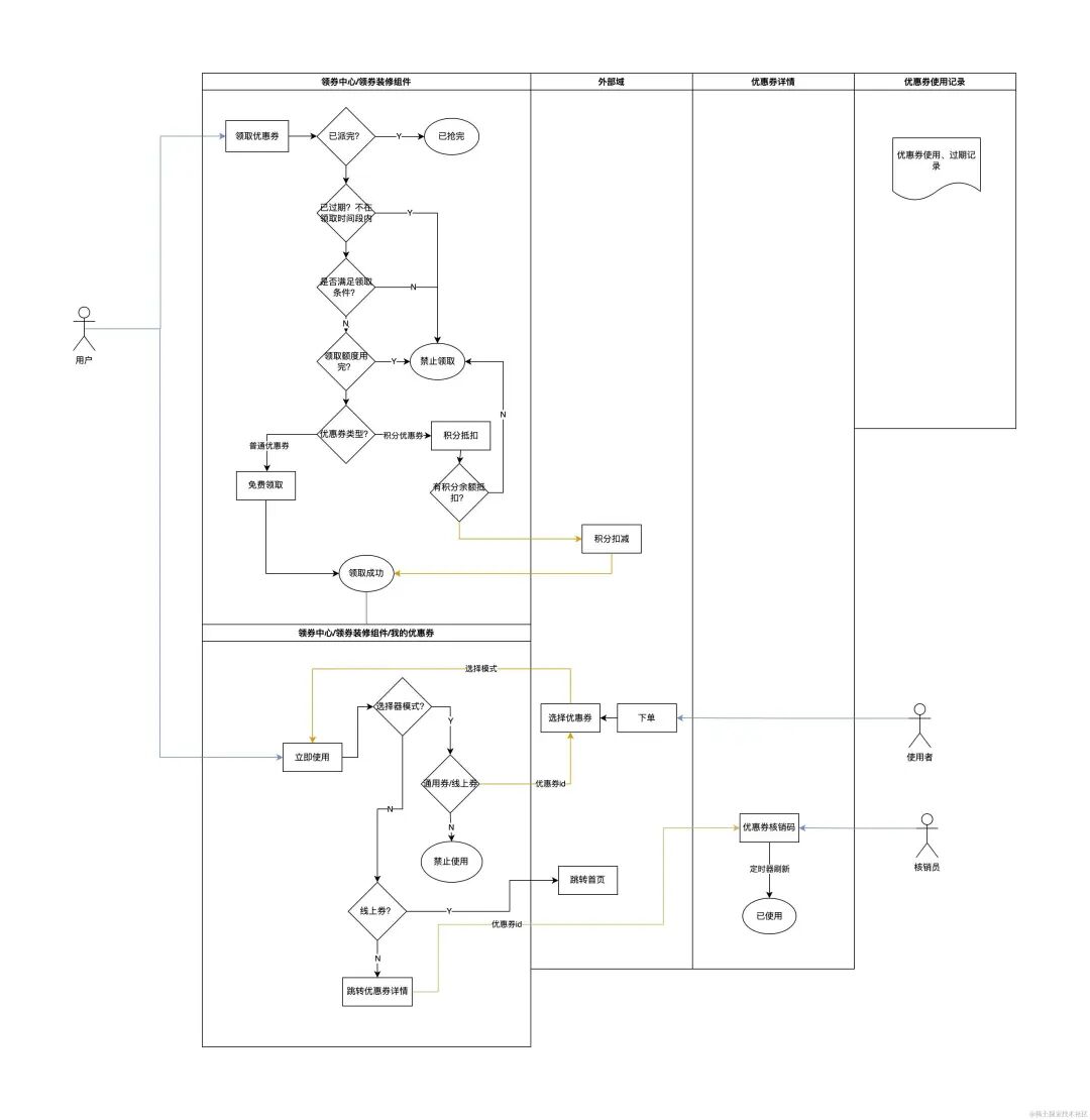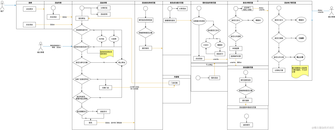 团长和团员的不同角色的业务使用黄色标记跨泳道之间的流程,用蓝色标记角色的业务发起点。
