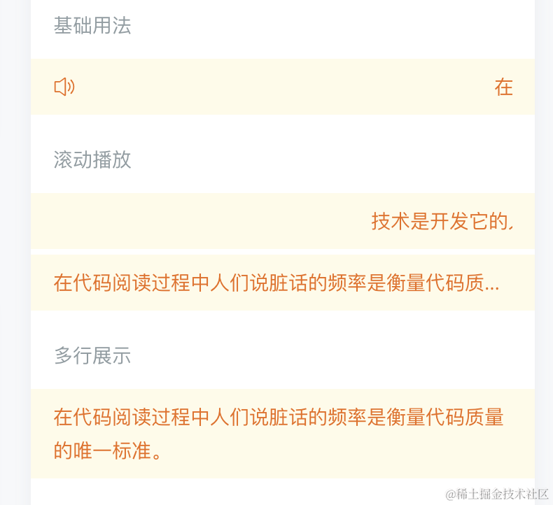 | scrollable | 是否开启滚动播放,内容长度溢出时默认开启 | boolean | |
