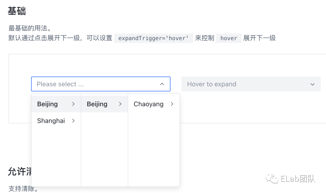 在前端组件中,应该提供对应的 API 属性或方法来支持额外的功能,给予开发者更充分的扩展空间,而不是有部分需求无法满足时放弃使用组件。以 Cascader 组件 为例(以下例子若无特殊说明,均来自 Arco 组件库),在通常情况下,仅需要使用左侧的基础选择器即可满足需求。