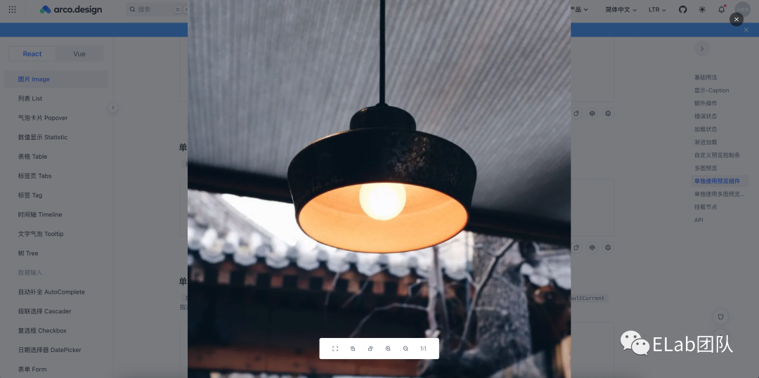🌰:图片预览功能通常依托着图片组件使用,在实际系统中,唤起图片预览的触发器不一定是图片,可能是按钮或其他触发事件,因此预览组件需要单独提供给开发者使用。预览组件作为 Image 的内部组件,开发者能够以 Image.Preview、Image.PreviewGroup 的方式使用,并提供左右切换、图片缩放等功能,用户可以通过 srcList、visible、actions、scales等 API 来控制并定制化预览组件。