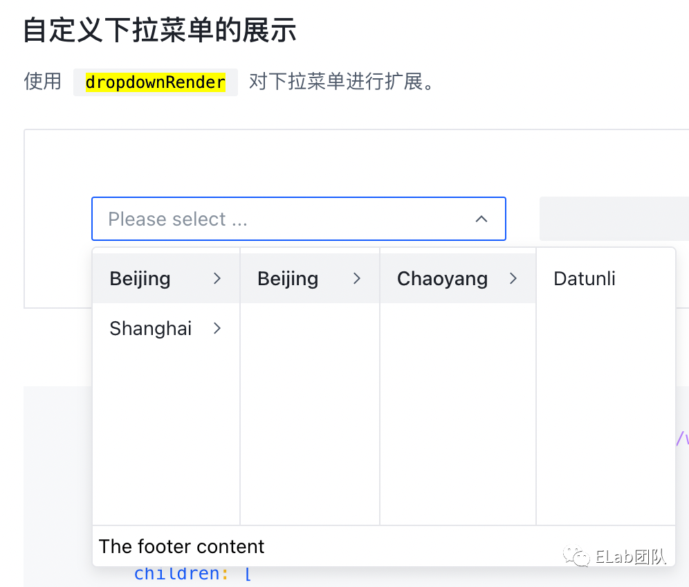 <Cascader options={options} dropdownRender={(menu) => { // menu 为所有选择器元素 return ( <div> {menu} <Divider style={{ margin: 0 }} /> <div style={{ margin: 4 }}> The footer content </div> </div> ); }} />与此类似的,还有 renderFooter、renderOption、renderFormat 等 API,这些 API 实现难度并不高,一定程度上将 DOM 元素的掌控权交予组件使用者,作为通用组件,为开发者提供了部分功能和样式的可扩展性。我们在设计前端组件时,多多留意组件中能够接管给使用者的渲染逻辑和操作逻辑,并将这些逻辑暴露出去。