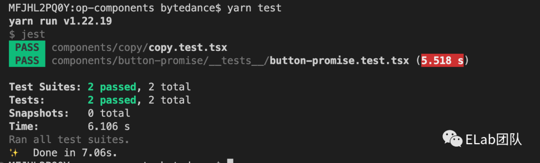 import { render } from '@testing-library/react';import xxx from '../src';describe('组件名', () => { test('测试功能1', () => { // 在这里写单元测试 }); test('测试功能2', () => { // 在这里写单元测试 });编写完测试用例后,执行 yarn test (命令已在创建组件时被初始化),可以看到测试结果
