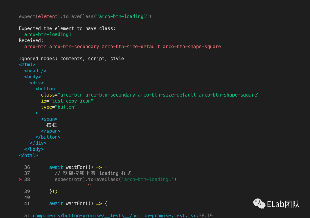 失败的结果,可以看到测试结果期望有 arco-btn-loading1 的类名,但是实际 received 到的类并没有