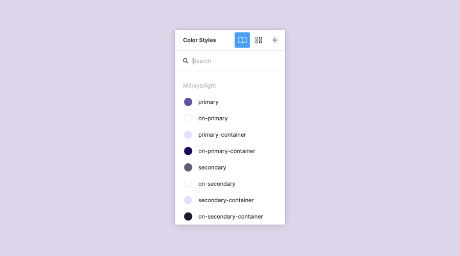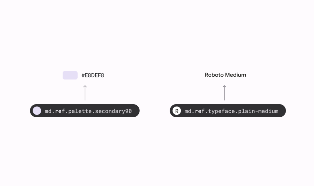 其命名以 .ref. 开头,指向一个静态值,如:表示颜色的十六进制代码(#E8DEF8)、字重(Roboto Medium)。