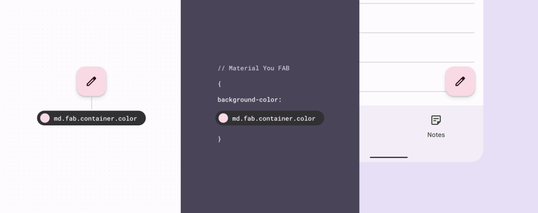 Design tokens 是存储样式值(如色值、字重)的载体。使用它,能简化设计系统的构建和使用,更能推进设计与代码的统一。如下图所示的案例中,FAB 按钮的颜色在设计稿和代码中,均被统一表述为: