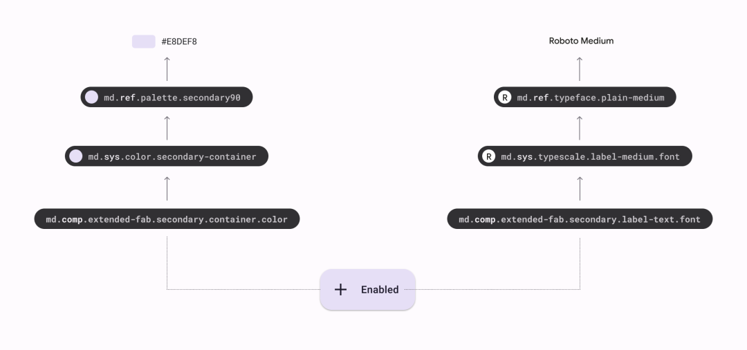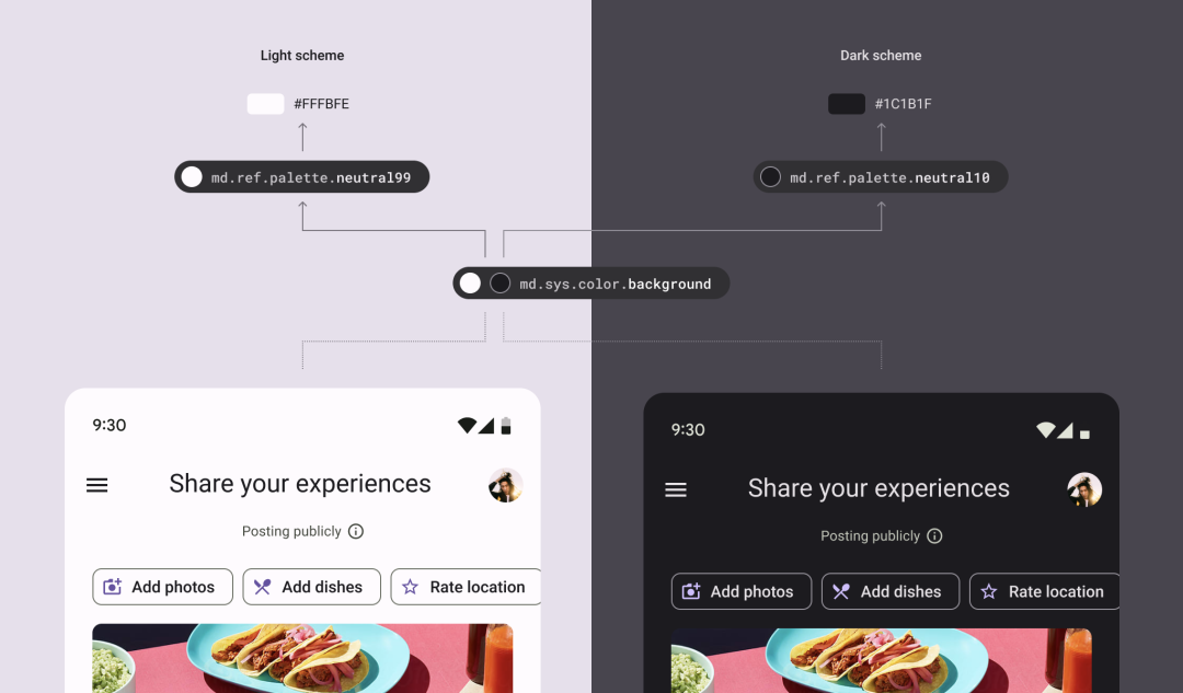 下图所示的案例中, md.sys.color.background 这一 system token 就会根据系统是否为深色模式来指向不同的 reference tokens: