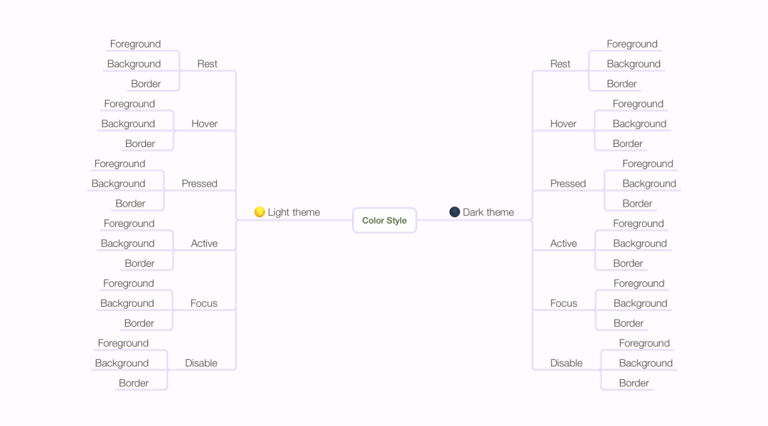["🌕 Light theme" | "🌑 Dark theme"] / ["Rest" | "Hover" | "Pressed" | "Active" | "Focus" | "Disabled"] / ["Foreground" | "Background" | "Border"]6
