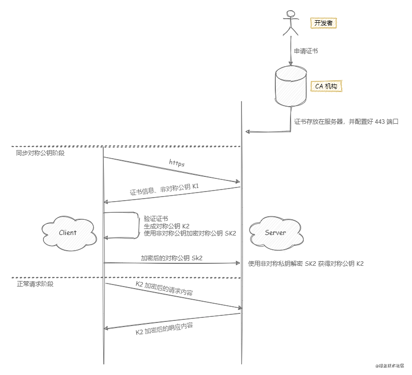 然后开始实际请求,客户端通过对称公钥加密请求,服务端接收请求后通过对称公钥解密