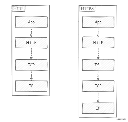 为了防止内容被窃听、伪装和篡改,HTTP 协议披上了 SSL 这件大衣,这也就成了 HTTPS 协议。所以 HTTPS 并非是应用层的一种新协议,只是 HTTP 通信接口部分用 SSL(Secure Socket Layer)和 TLS(Transport LayerSecurity)协议代替,原本 HTTP 直接和 TCP 通信,当使用 SSL 时,则演变成先和 SSL 通信,再由 SSL 和 TCP 通信。