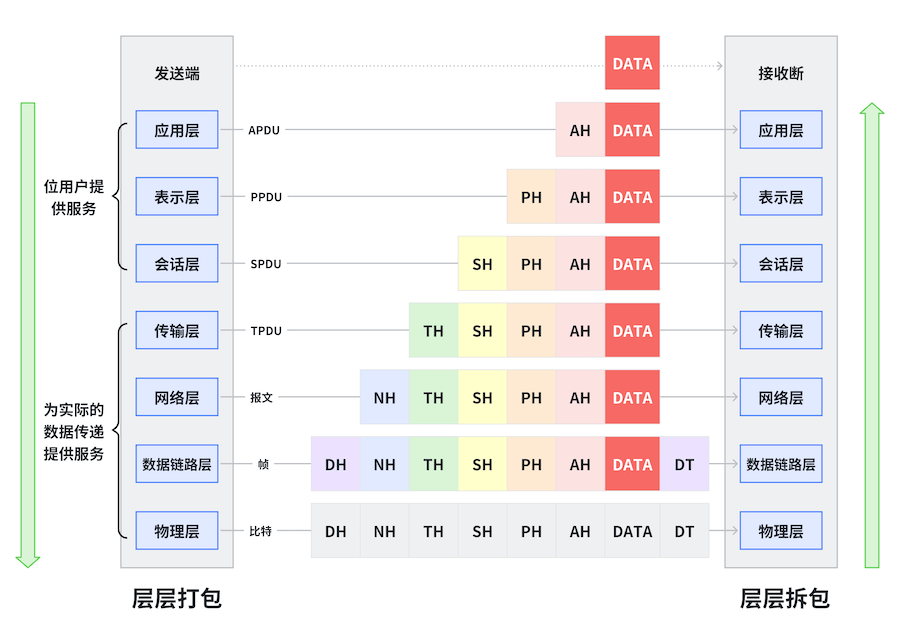 数据的发送流程是层层打包,而接收流程则是层层拆包。