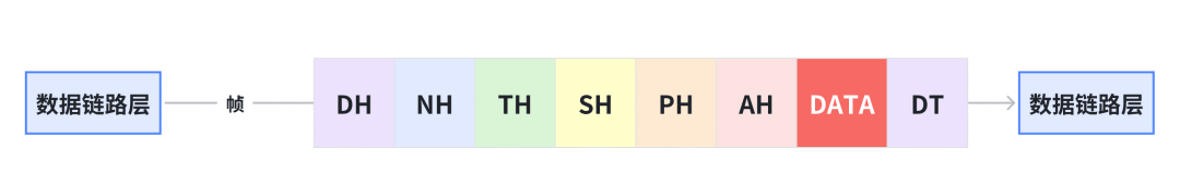 **数据形态:**数据帧。该层为数据添加帧头和帧尾,帧头包含源 MAC 地址和目标 MAC 地址(下一跳设备),并进行错误检测(CRC 校验)。此时数据状态为:FrameHeader(SrcMAC:00:1A:2B:3C:4D:5E, DstMAC:00:1F:2B:3C:4D:5E) + IPHeader + TCPHeader + SessionHeader + Encrypted(UTF-8("在吗?")) + FrameTrailer(CRC) 。