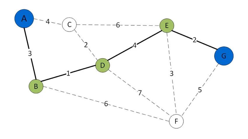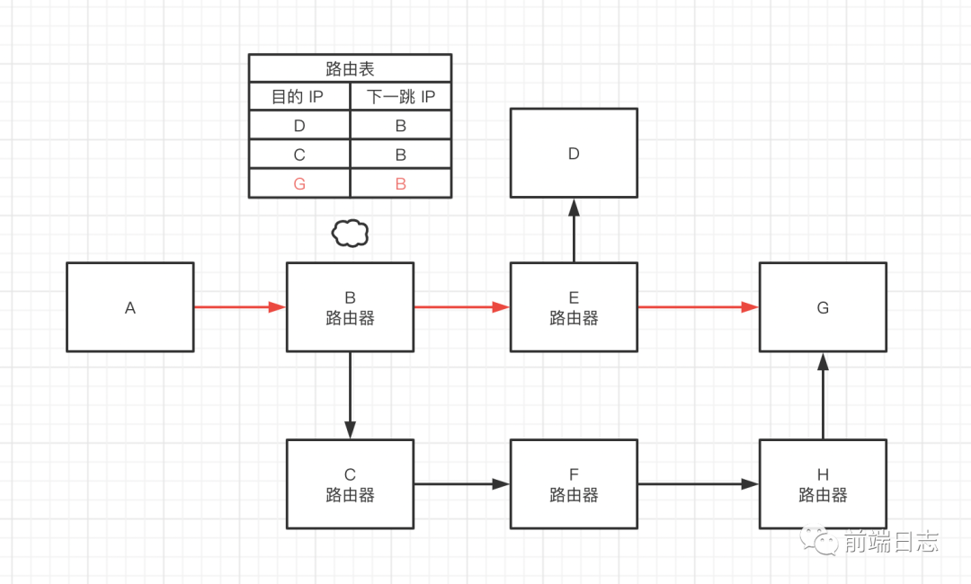 B 查询路由表,发现下一跳为 E,于是把数据传给 E。
