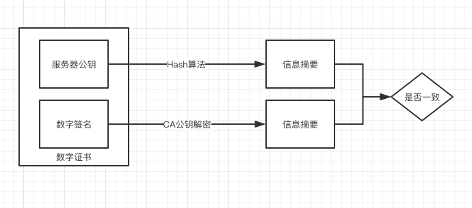 可以看到,数字证书通过同样的算法进行解密,如果得到相同的信息摘要,就能保证数据是有效的,如果不一致,则会验证失败,拒绝后续的请求。
