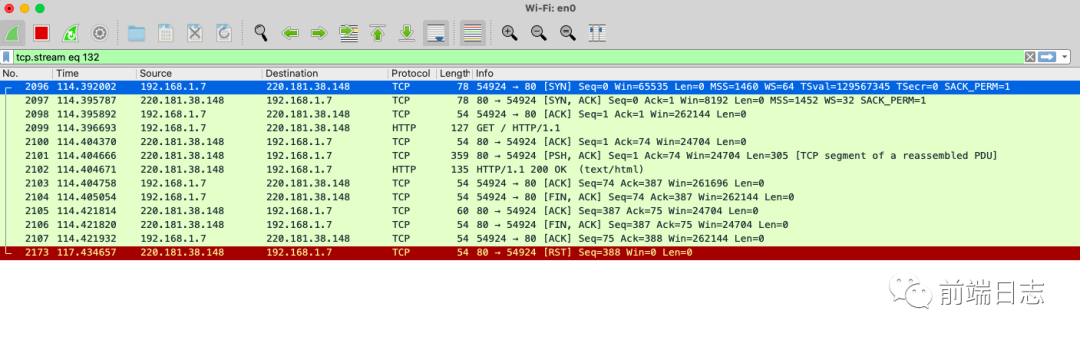 图中可以看到,请求 baidu.com 时,首先通过 TCP 3 次握手建立连接,然后通过 HTTP 传输内容,最后通过 TCP 4 次挥手断开连接。