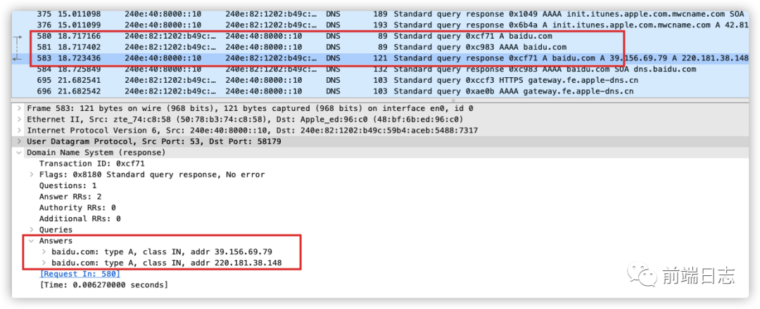 经过 DNS 解析后,我们就能得到 baidu.com 的 IP 地址了:39.156.69.79 和 220.181.38.148,通常客户端会随机选中一个 IP 地址进行通信。