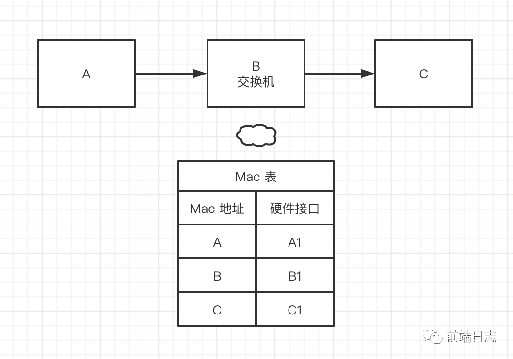 B 查询 Mac 表,根据目的地 Mac 地址,匹配 C 的硬件接口。