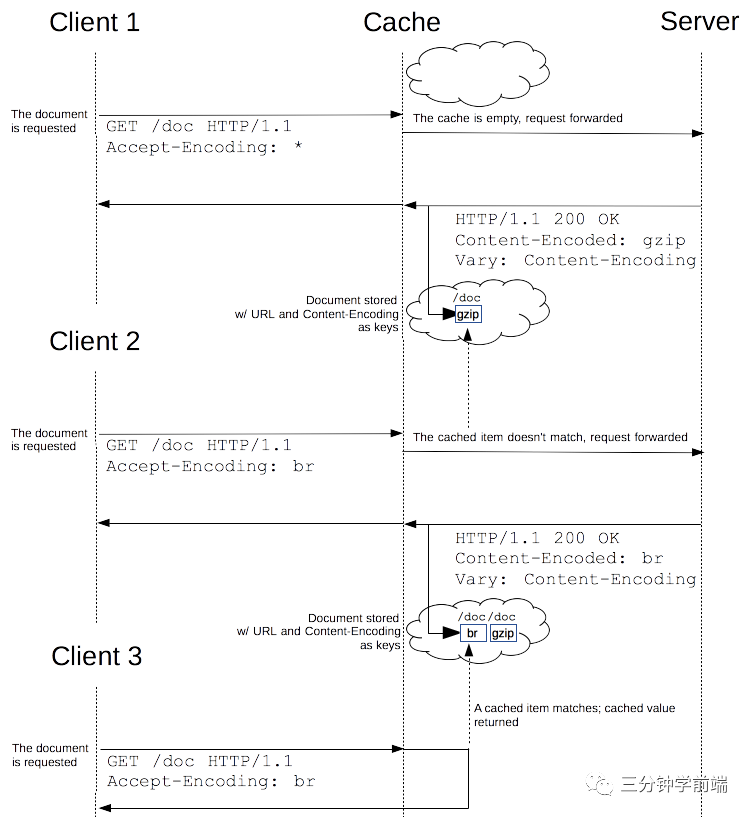 服务器通过指定 Vary: Accept-Encoding ,告知代理服务器,对于这个资源,需要缓存两个版本: