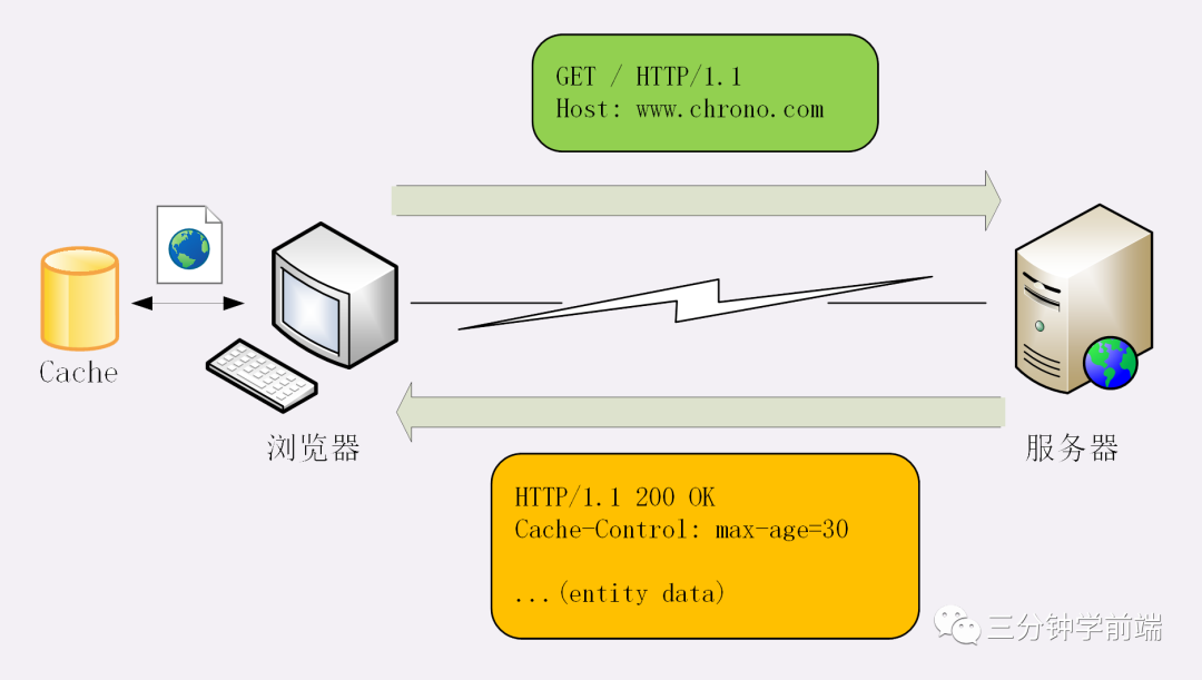 浏览器与服务器通信的方式为应答模式,即浏览器发起 HTTP 请求,服务器响应请求。在浏览器第一次发起请求时,会根据响应报文中 HTTP 头的缓存标识,决定是否缓存结果,如果是则将请求结果和缓存标识存入浏览器缓存中,简单的过程如下图: