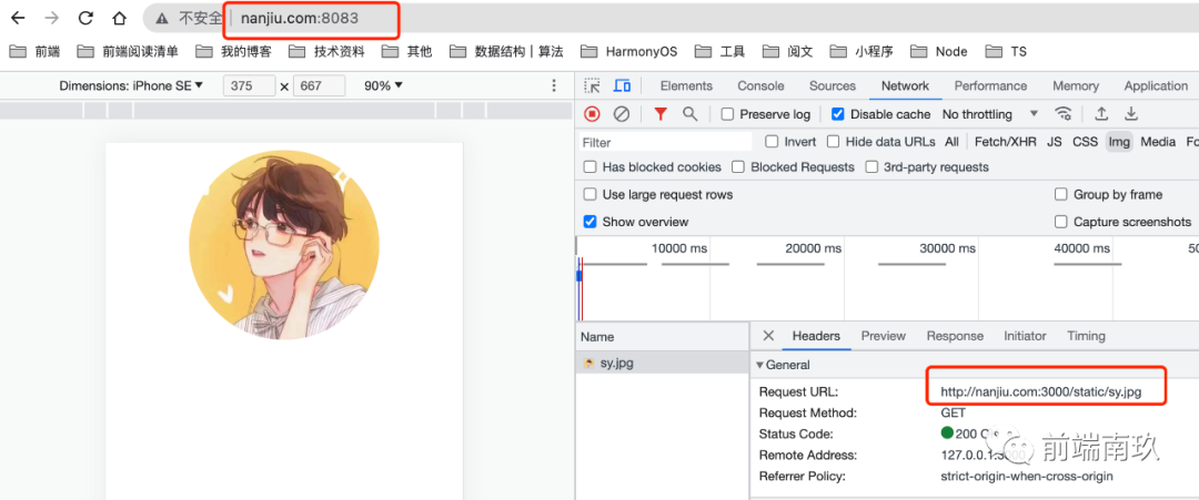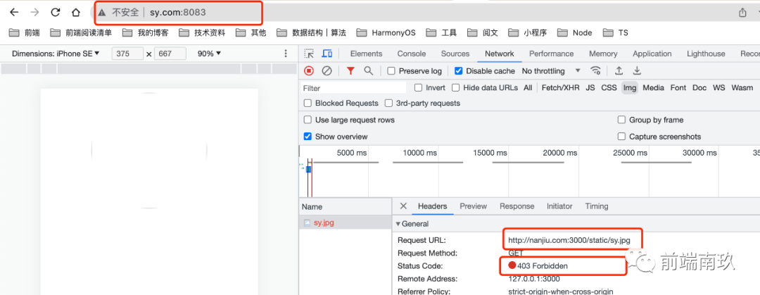 当前端页面使用sy.com这个域名去访问nanjiu.com域名下的图片时,此时应该是会进入防盗逻辑,返回 403