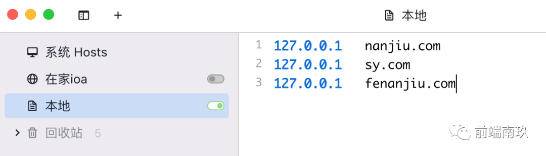 这里没有域名也不用担心,我们可以直接本地模拟就行了,比如我这里使用SwitchHosts给本地添加的三个域名并且都指向我们的本地 IP