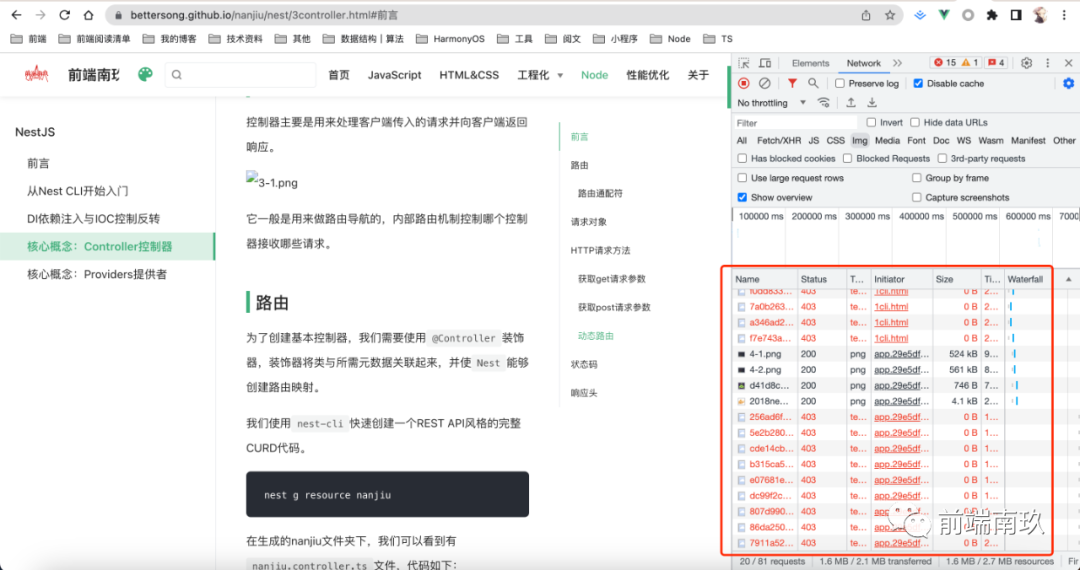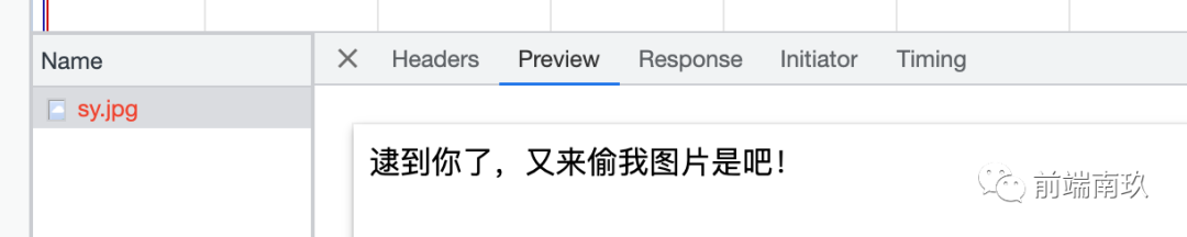 // 白名单const whiteList = ['nanjiu.com', 'fenanjiu.com'] // 图片防盗中间件function imgMiddleware(req, res, next) { console.log('--req', req.headers) // 获取资源类型 const type = req.headers.accept || '' if(!type.includes('image')) { // 不是图片资源,直接放行 next() return } const referer = req.headers.referer || '' // 获取referer的域名 const { hostname } = url.parse(referer, true) if(referer && whiteList.includes(hostname) || !referer) { // 访问域名在白名单内,放行 !referer表示直接访问图片(比如浏览器地址栏输入图片地址) res.status(200) next() }else { // 访问域名不在白名单内,返回403 res.status(403) res.send('逮到你了,又来偷我图片是吧!') } }这里需要注意的是,全局中间件在使用时一定要在useStaticAssets之前
