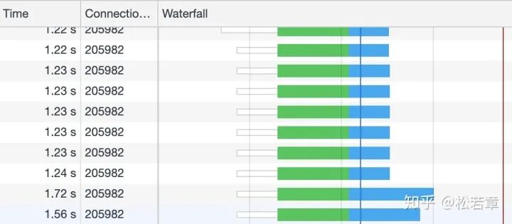 绿色是发起请求到请求返回的等待时间,蓝色是响应的下载时间,可以看到都是在同一个 Connection ,并行完成的
