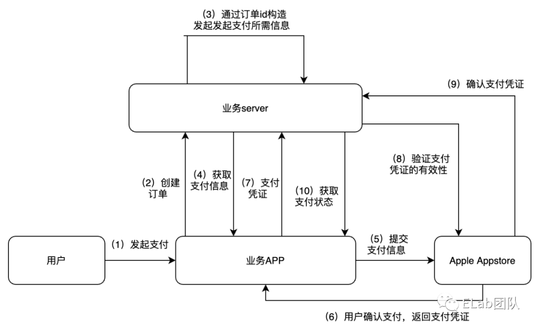 涉及 4 个关联方,用户、业务 APP、业务 server、Apple Appstore。详细流程如下: