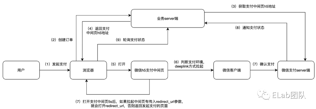 涉及 6 个关联方,用户、浏览器、微信 h5 支付中间页、微信客户端、微信支付 server 端、业务 server 端。详细流程如下: