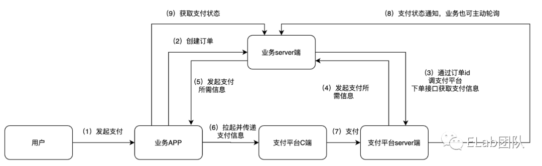 支付流程图如下:涉及 5 个关联方,用户、业务 APP、业务 server 端、支付平台 C 端,支付平台 server 端。目前国内主要支付平台为微信和支付宝。详细流程如下: