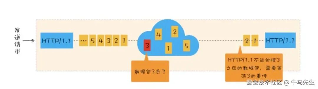 TCP 的队头阻塞:主要因为超时重传,在传输数据包的过程中,一旦出现某一个包丢失,后续的所有数据包都要等待该丢失的数据包重新整理打包发送,后续包才能继续传输。