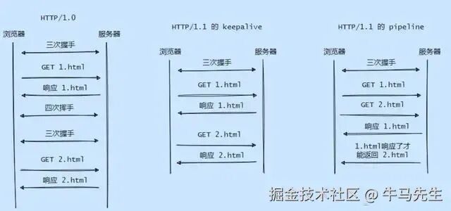 1.1 建立了长连接,也叫持久连接。在 1.0 版本中,每次客户端向服务端请求数据都需要经历三次挥手、发送请求、接收响应、四次挥手这几个步骤,也不是说这些步骤不重要,只是当浏览器先请求 html,接着又需要 css,这样一次次的建立连接,断开连接是很浪费时间的。