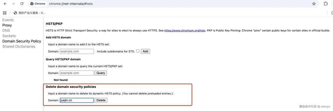 chrome://net-internals/#hsts输入: test.example.comStatic STS domain: yes ← 在浏览器内置列表中Static upgrade mode: FORCE_HTTPSStatic STS include subdomains: yes3. 确认问题:Preload 强制所有子域名用 HTTPS