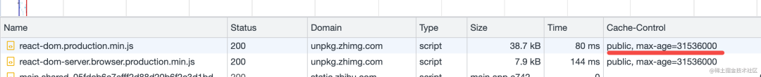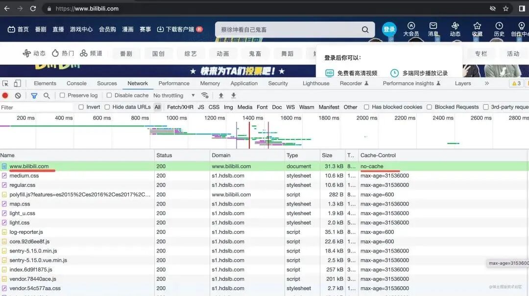 可以看到入口请求,也就是 html 的请求设置了 no-cache,其他所有的后续的资源都设置了强缓存 max-age。