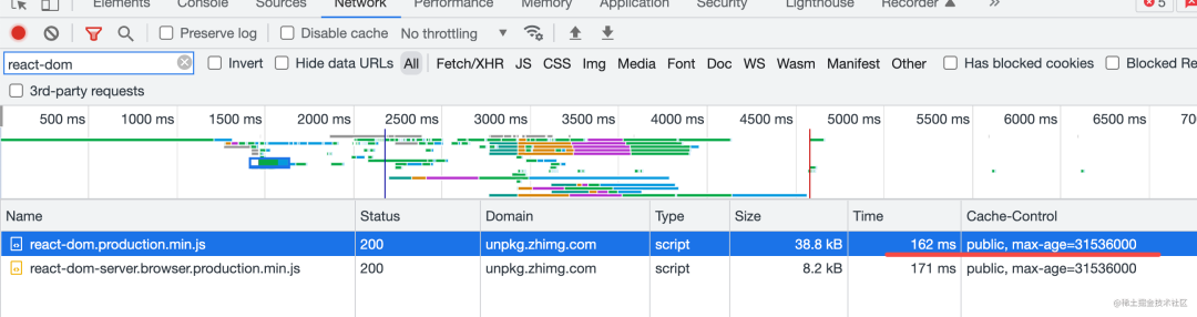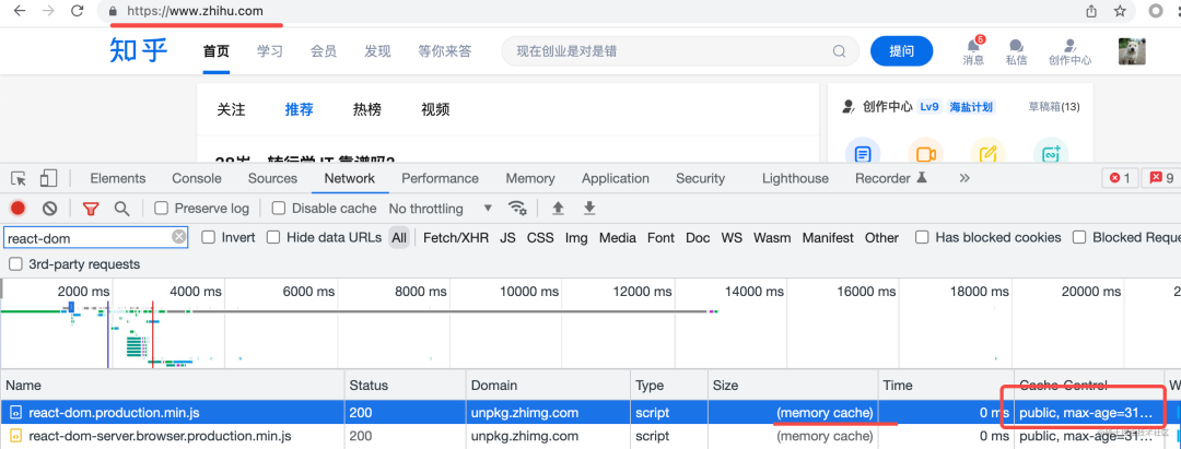 比如 zhihu 的网站里用到了 react-dom.production.min.js 这个文件,它被缓存了,所以普通刷新直接拿的本地强缓存: