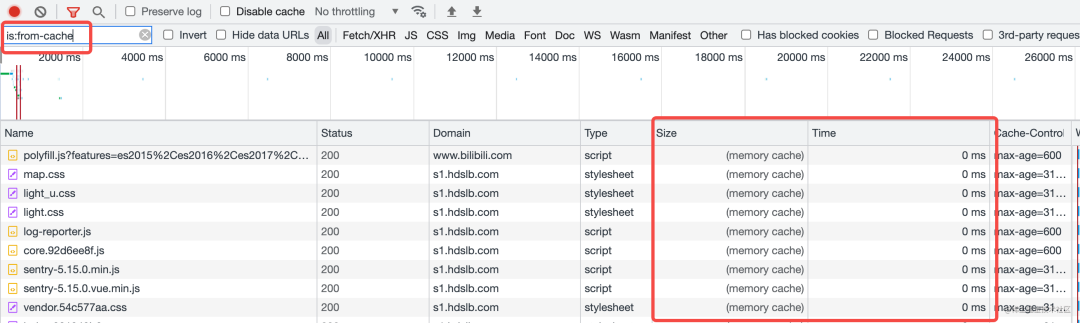可以通过 is 过滤器来过滤 from-cache 的请求,也就是所有直接拿了强缓存的请求: